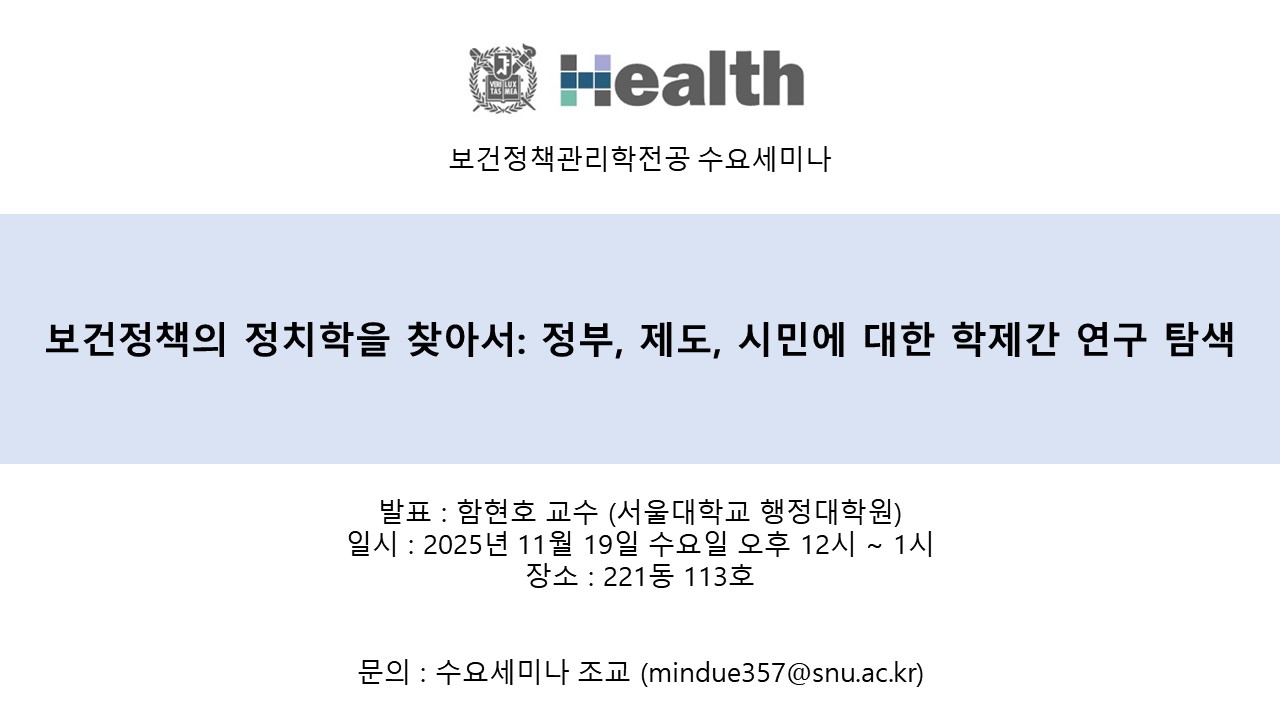 11월 19일 수요일 12시-13시, 221동 113호에서 보건정책관리학 수요세미나가 진행됩니다.