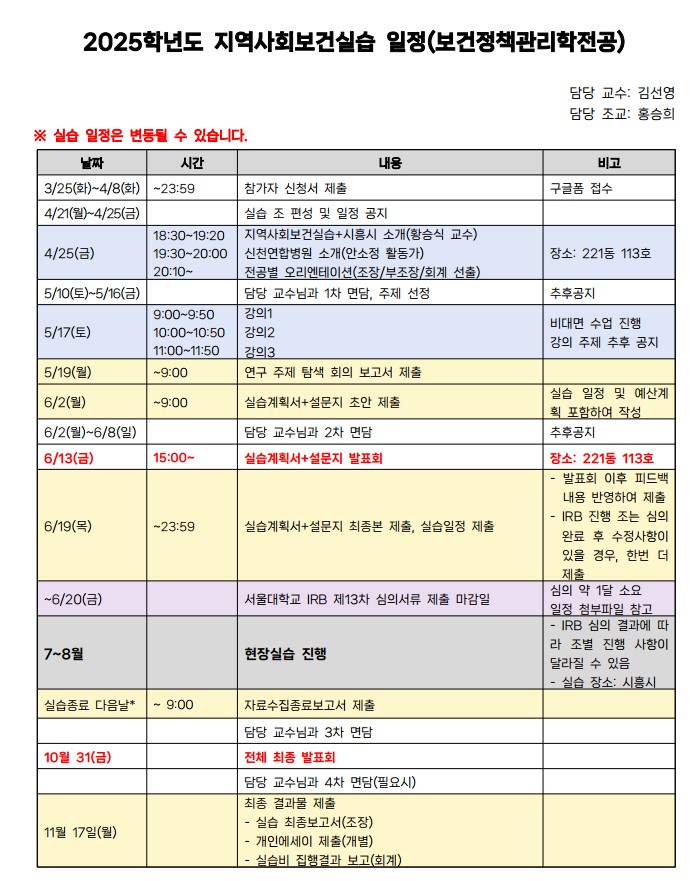 [최종수정][정책] 2025년도 지역사회보건실습 일정 안내