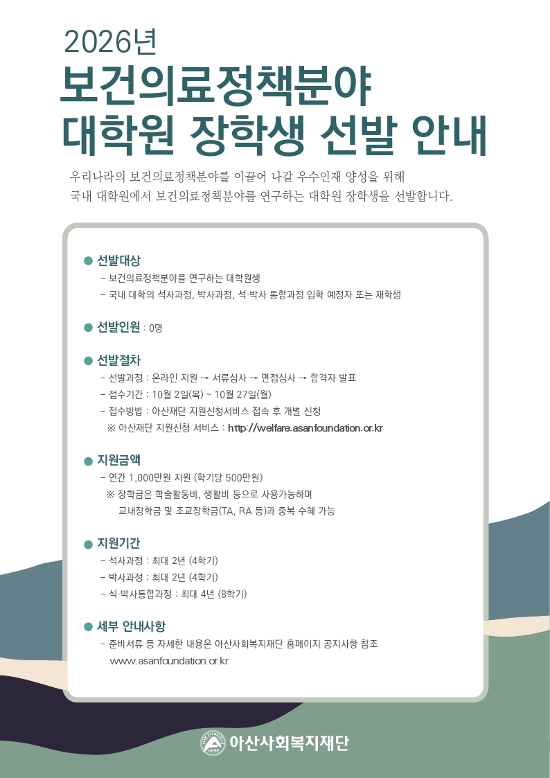 [아산사회복지재단] 보건의료정책분야 대학원 장학생 선발 안내