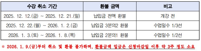 2025학년도 동계 계절수업 수강료 납부 및 환불 안내