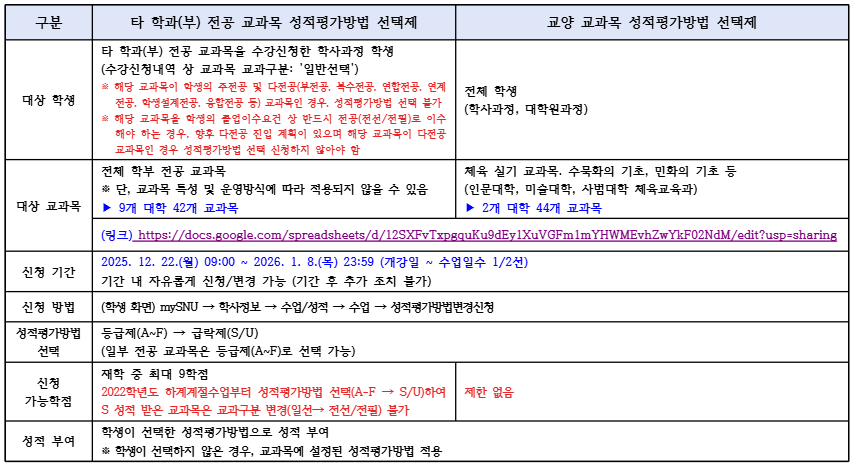 ▶ 성적평가방법 선택 가능 교과목 목록