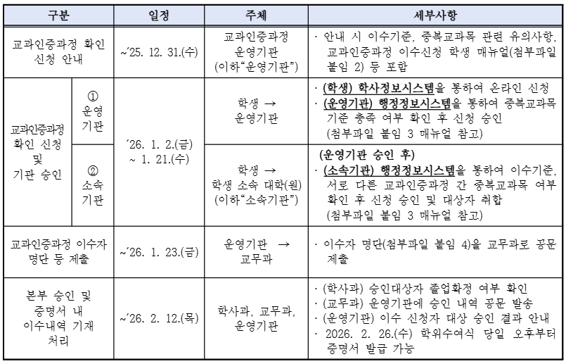 2025학년도 전기(2026. 2월) 졸업예정자 대상 ⌈서울대학교 교과인증과정⌋ 이수 신청과 관련하여 붙임과 같이 알려드리니, 이수 신청 및 확인 절차를 숙지하시기 바랍니다.