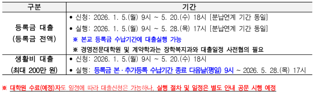 한국장학재단에서 실시하는 2026학년도 1학기 학자금대출 계획을 알려드립니다.